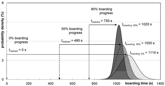 To predict the duration of aircraft boarding, the stochastic simulation model could be used with specific assumptions for the day of operations such as the position of the aircraft (apron, gate), doors to be used, number of boarding counters, aircraft type (e.g., A31x, A32x, B737), number of passengers booked (e.g., seat load factor, specific seats used), characteristics of passengers (e.g., premium, economy, hand luggage), or boarding sequence. Finally, this specific parameter set is implemented into the simulation environment and results in both an average boarding time and a corresponding standard deviation. During the course of boarding, the number of passengers seated in the aircraft increases constantly (realized boarding time) and the stochastic component of boarding time has a decreasing influence on the final boarding time. In Figure 16, the implication of the decreasing uncertainty during the course of boarding is shown, indicated by higher values of the corresponding probability density function. Here, boarding progresses of 0%, 50% and 80% are used as examples, with a realized progress time tr. The prediction of expected boarding time t0 starts at 1103 s (0% progress, 100% stochastic) and the last prediction (80% progress, 20% stochastic) results in 1021 s, with standard deviations of 78 s and 35 s, respectively.