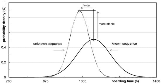 Furthermore, the boarding time could be predicted with a higher level of reliability (more stable boarding progress), if the exact sequence of passengers is known beforehand. However, the boarding times still consist of a normal distributed characteristic, as Figure 17 demonstrates by using probability density.