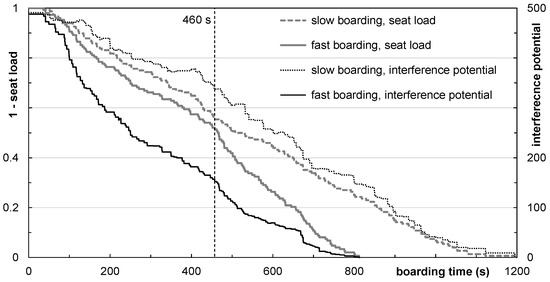 In Figure 18 the progress of the interference potential and the seat load are shown. The gray, vertical line labels a point in time (460 s) where the progress of the seat load provides no clear indication of which boarding strategy will be faster. However, the newly developed interference potential demonstrates that the boarding marked with a solid line has a significantly lower value for the interference potential, which leads to a shorter boarding time [55].