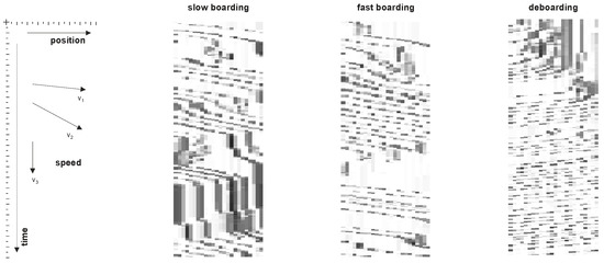 In Figure 20 the sensor results of two different boarding scenarios are shown: slow and fast boarding. Herein, the x-axis shows the position along the aircraft aisle and the y-axis shows the time. Consequently, this kind of representation allows for determining maximum walking speed of passengers, and an indication of congested areas in the aisle. The slow boarding scenario clearly consists of more congested areas (waiting queues), while the fast boarding shows mainly unconstrained passenger movements in aircraft aisle. A preliminary analysis of the average unconstrained (maximum) speed of passengers results in 0.78 m/s, with a standard deviation of 0.31 m/s during boarding and a speed of 0.99 m/s with 0.24 m/s during deboarding.