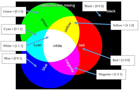 Both additive and subtractive color models are typically represented in vector form. Both color models relate to the perception of the human visual system. In the additive color model, the background is black, and color is composed of a red, green, and blue (RGB) tuple as depicted in Figure 1. This relates to the three cone cells of the human retina (long, medium, and short) which have peak sensitivities to light of wavelengths 559 nm, 531 nm, and 419 nm. These correspond to red, green, and blue light, respectively [46]. Normally, red, green, and blue color may be written in 8-bit form as [255 0 0], [0 255 0], and [0 0 255], respectively or in normalized form as [1 0 0], [0 1 0], and [0 0 1], respectively.