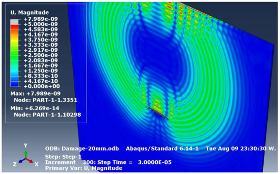 The approach is demonstrated by taking screenshots from the ABAQUS Viewer User Interface. Figure 3a shows Lamb wave propagation at t = 100 μs in an uncracked Al-7075 plate. The simulation images are actually similar to those which are depicted in Figure 4 of [16], except that the simulation platform, color map, excitation signal, and the geometries are slightly different.