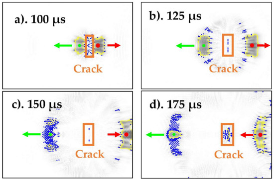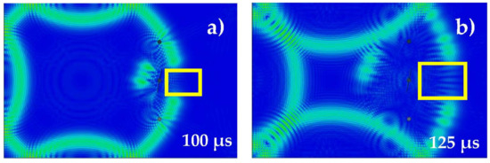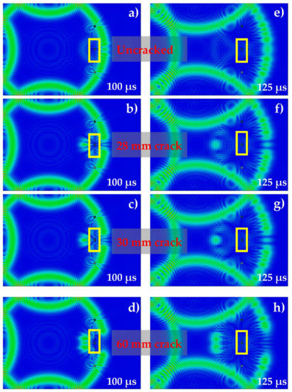 A similar pattern of Lamb wave propagation can be observed if the crack length differs by +/− 10%, as shown in Figure 3c. In this case, the crack length is 30 mm instead of 28 mm. However, if the crack is much larger, a notable change in the wave propagation pattern can be observed, as depicted in Figure 4d. In this case, the crack length is 60 mm. Similarly, the wave propagation at t = 125 μs for an uncracked plate, and for plates with crack lengths of 28 mm, 30 mm, and 60 mm can be observed in Figure 3e–h, respectively.