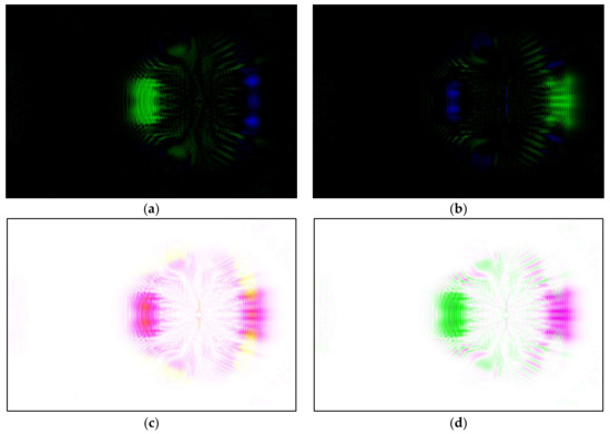 (a) Differential image of (3h − 3e); (b) Differential image of (3e − 3h); (c) Inverse of added image (4a + 4b); (d) Inverse of fused image (4a + 4b).