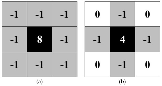 For the blob detection, the kernel of 8-pixel connectivity is used because it is more suitable for a larger area since the diagonal neighbor is counted as well, see Figure 5a, while 4-pixel connectivity (Figure 5b) is typically used for line and corner detection. In Figure 5a,b, the meaning of −1 and 0 are pixels which are counted and are not counted as a neighbor of the center pixel, respectively.