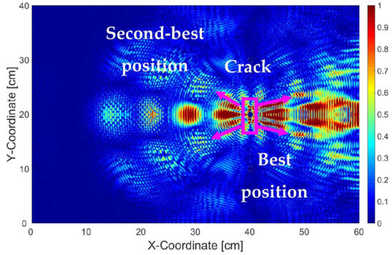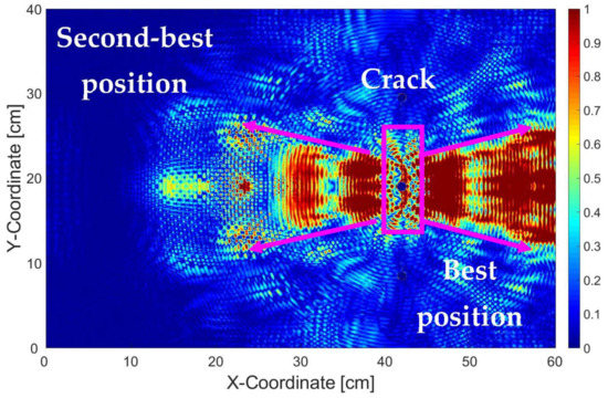 Furthermore, it is possible to fuse Figure 6a–d into a single image. We performed this operation and the result is depicted in Figure 7, where each pixel contains information about the normalized intensity between 0 and 1 which is then mapped into the rainbow color scale. From Figure 7, it can be subjectively judged that the best sensor position is between X = 44 cm and 57 cm and the second-best sensor position is between and X = 34 and 38 cm, while the vertical coordinate for both positions remains at Y = 20 cm.