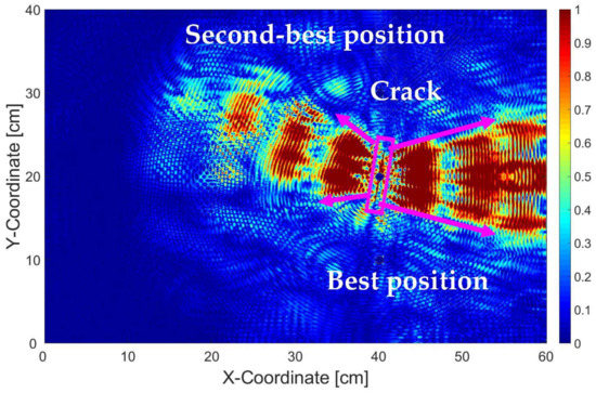 From Figure 8, it can be seen that the areas with higher pixel intensity (colored in red with value between 0.7 and 1) is smaller than those of Figure 7. This is absolutely normal, since the wave perturbation at the crack front due to a crack length of 30 mm is smaller than those of 60 mm.
