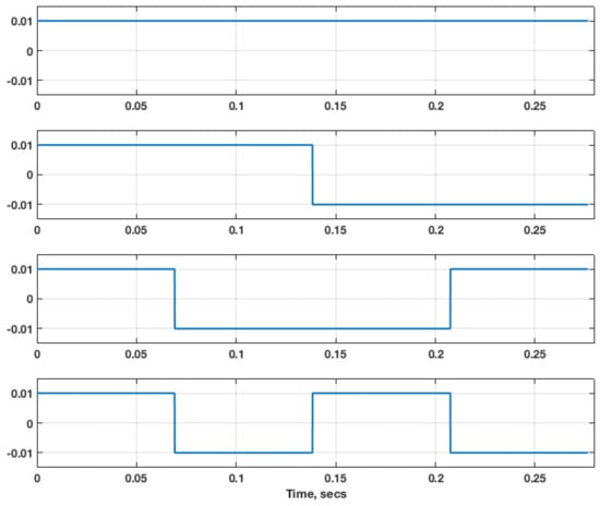 In a previous paper [], four families of functions were investigated to efficiently identify a CFD-based unsteady aerodynamic state-space model. For the present paper, the Walsh family of orthogonal functions [] are used, shown in Figure 1 for four modes. These functions are orthogonal and therefore provide a benefit in the system identification process as discussed above. Also, this family of functions consists of a combination of step functions, which have been shown to be well-suited for the identification of CFD-based unsteady aerodynamic ROMs.