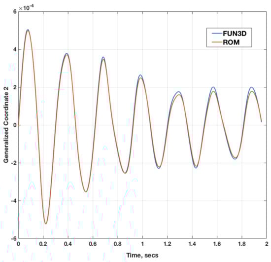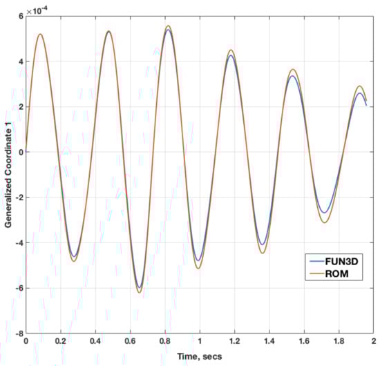 Aeroelastic transients for the AGARD 445.6 aeroelastic wing [] from the FUN3D full solution and from the aeroelastic ROM, for inviscid and viscous solutions, are presented in this section. The FUN3D full solution aeroelastic transients are presented for two Mach numbers (M = 0.96, M = 1.141) at various dynamic pressures. FUN3D full and ROM aeroelastic solutions are compared at specific dynamic pressures, including root locus plots.