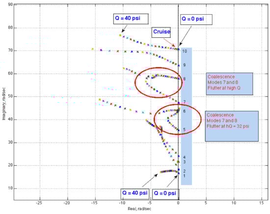 This ROM technology has the ability to rapidly generate an aeroelastic root locus plot that can reveal the aeroelastic mechanisms occurring at that flight condition. The aeroelastic root locus plot for the low-boom N+2 configuration at M = 1.7 is presented in Figure 9, revealing the aeroelastic mechanisms that affect this configuration. Each symbol represents the aeroelastic roots at a specific dynamic pressure, corresponding to a 2 psi increment in dynamic pressure.