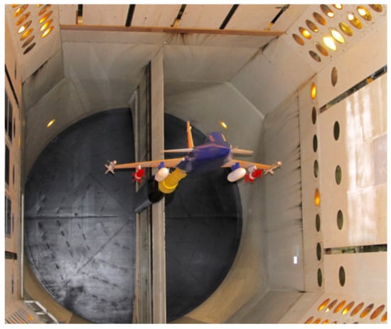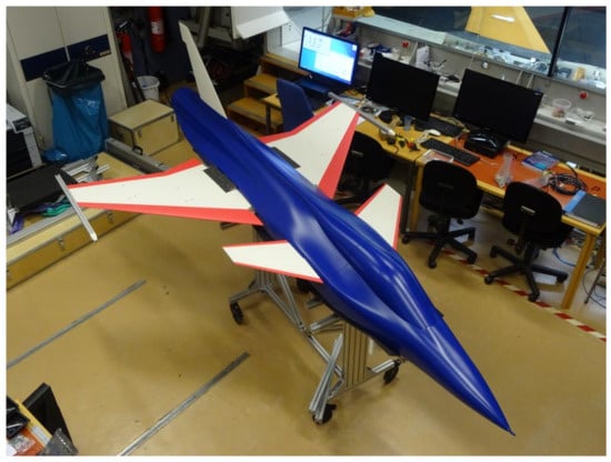 A generic fighter flutter-model version of these earlier models was selected for the collaborative wind-tunnel testing campaign between the KTH and NASA. Shown in Figure 10 is the new model, with a similar outer mold line (OML) to the Gripen, but modified into a more generic fighter configuration. Details regarding the design, fabrication, and instrumentation of the wind-tunnel model can be found in the reference paper []. Figure 11 shows the wind-tunnel model installed in the TDT.