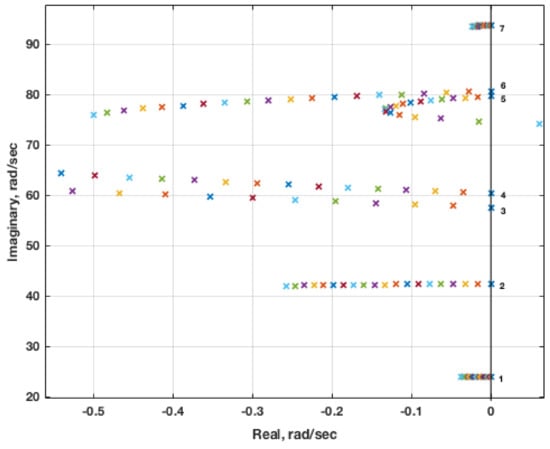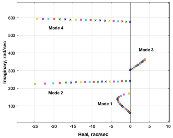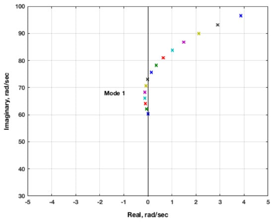 Figure 17 presents a close-up version of the root locus plot. The dynamic pressure for this root locus plot starts at 0 psf with an increment of 6 psf, resulting in a flutter dynamic pressure of approximately 30 psf, consistent with the full FUN3D solution flutter dynamic pressure []. The inviscid result does not compare well with the experimental flutter dynamic pressure at this Mach number. Inviscid solutions tend to have stronger shocks that are farther aft and, therefore, induce a stronger and earlier onset of flutter, so this discrepancy is not surprising. Including viscosity, the shock strength is reduced and the shock moves forward, yielding a higher flutter dynamic pressure.