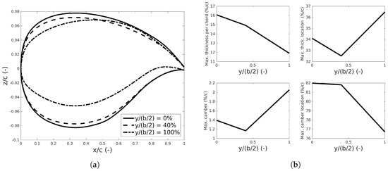 Figure 2. The airfoil details of the reference aircraft. (a) The airfoils of the reference aircraft; (b) the thickness and camber information of the airfoils.