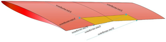 The Trailing Edge (TE) morphing starts by extracting the camber curve and thickness distribution from the airfoil data [40]. The auto-morphing scripts create new sections (as required) at control surface edges. The new section camber curves are morphed according to the deflection angle, to which the thickness is added. Figure 20a illustrates the camber controlled by quadratic Bézier curves for morphed leading and trailing edges with the thickness distribution preserved. The quadratic Bézier control points are chosen to give (at least) G1-continuity of the deformed camber curves. Issues related to crossing of camber curve normals close to control surface edges must be addressed. The camber curves for morphed leading and trailing edges are based on the Class–Shape function Transformation (CST) approach [41]. It enables easy geometry manipulation by user-defined parameters such as the hinge line, rotation angle and the transition zones; see Figure 20b.