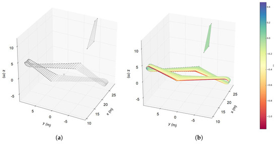 • A Python wrapper, dedicated to high-level tasks such as communication with CPACS, pre- and post-processing for VLM, as well as visualization of the model and generated results; see Figure 7a,b,