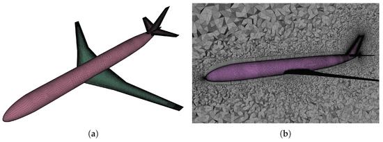 Figure 9. The surface and volume meshes of the reference aircraft generated by Sumo with TetGen and Pentagrow. (a) Sumo surface mesh; (b) Sumo-Pentagrow RANS mesh.