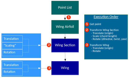 The hierarchical data structure is used to define the order of “construction” of each aircraft component (fuselage, wing, etc.). Figure 4 shows, for example, the construction of a wing geometry from the CPACS data. Other parts of the aircraft are treated similarly. For wings, the construction begins with ordered lists of points, which define airfoils. A library of airfoils identified by profileUIDs can be stored in the CPACS geometry definition and from these, a list of wing elements. An element is defined by its profileUID and a transformation: the scaling along coordinate directions, a 3D rotation and a translation. Two such elements define a section, the positioning of which is effected by a length, sweep angle and a dihedral angle. The sections are assembled to form a wing, to which it is possible once more to apply a transformation. Symmetries can be used to create instances of wings already defined, A single CPACS file holds a set of named lifting surfaces defined in this way. It must be noted that a given wing geometry allows multiple distinct CPACS definitions.