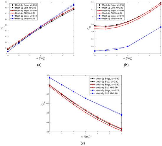 Figure 12. Euler simulations for the reference aircraft for C L , C D and C m computed by Edge and SU2 for meshes “mesh-2p” and “mesh-4p”, at a flight altitude of 10,000 m, Mach 0.78 and Mach 0.9 respectively. (a) Lift coefficient C L for Mach number of 0.78 and 0.9; (b) drag coefficient C D for Mach numbers of 0.78 and 0.9; (c) pitching moment coefficient C m for Mach numbers of 0.78 and 0.9.