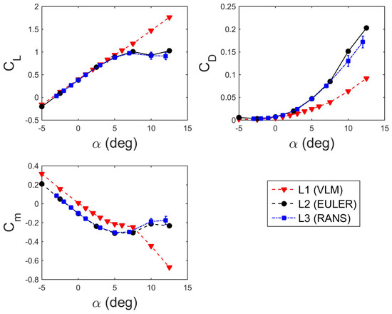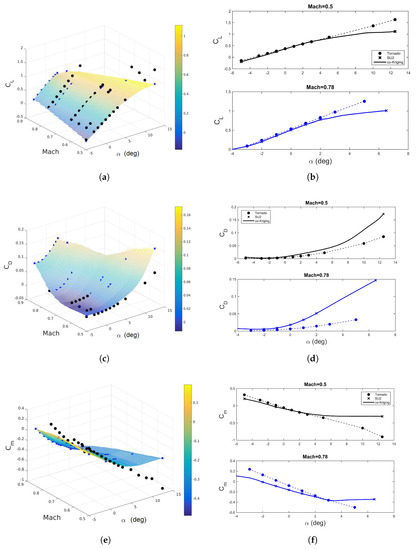 The good agreement for some ranges obtained by different fidelity aerodynamic tools supports the idea of building a surrogate model trained by an automatic sampling approach that takes advantage of each method according to their fidelity levels and limitations. For example, it is useless to spend computational time with Euler calculations in the linear aerodynamic region where Tornado can give reliable results. This computational time is better spent on higher Mach number or angles of attack where the cheapest tools fail. An application of the “variable fidelity” technique is to fuse the data from different fidelity levels of tools by kriging and co-kriging [34]; see also [14].