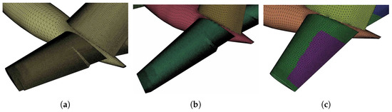Figure 19. The mesh generated by Sumo with different modeling technologies to be computed for elevator deflection at 6 . (a) Surface mesh with mesh deformed by FFD on the elevator for δ e = 6 degrees; (b) surface mesh with morphed elevator modeled by Sumo for δ e = 6 degrees, which includes a linear type 5% transition zone of the morphing elevator length; (c) tailplane and the elevators marked in the surface mesh in Sumo.