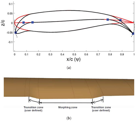 Figure 20. The demonstration of the automatically gapless movable surfaces morphing technology by Sumo. (a) The geometric parameters describing the morphing airfoil [40], morphing leading edge and trailing edge and a fixed central area using a variable camber; (b) illustration of the morphing trailing edge with the morphing zone and transition zones modeled in Sumo.