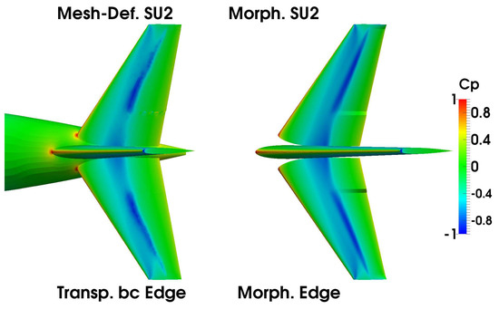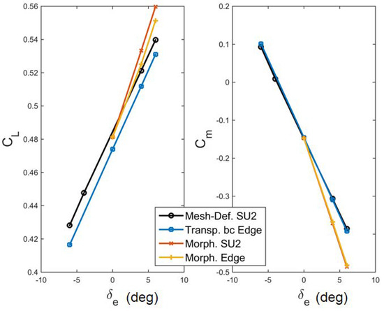 This section shows the results of the control surface modeling approaches with different CFD solvers. Figure 21 and Table 1 show the comparisons for C L , C m and their derivatives for elevator deflection ± 6 , at Mach 0.78, altitude 10,000 m, α = 0 . We expect close agreement for morphing elevators computed by SU2 and Edge, by mesh deformation, as well as morphing. The solutions for mesh deformation by SU2 FFD and transpiration boundary condition by Edge are quite comparable. The morphing control surface model predicts slightly higher slopes for both C L and C m and a smoother flow on the horizontal tail (see Figure 22), probably due to the transition part of the morphed shape. Note that the transition zone as defined in this case gives a slightly larger deflected area.