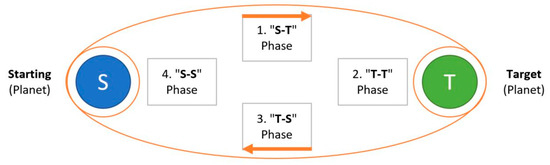 The generic Stopover Cycler between a Starting planet and a Target planet and its four phases: “in the first one, referred to as S-T phase, the spacecraft is transferred from the starting to the target planet. The spacecraft then orbits around the target and waits for the next opportunity to return back. This waiting time at the target is denoted by T-T phase, whereas the return voyage towards the starting planet is called T-S phase. The stopover cycler ends with a waiting S-S phase at the starting planet, whose duration is equal to the time length necessary for the planets to return in the same relative configuration they occupied at time t0” [3].
