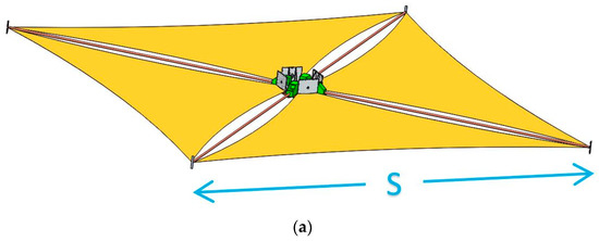 Although several configurations exist, spaceborne sails have often been conceived of as square flat systems made of four sail segments deployed by booms from a box-shaped “Sail Module”, shown open on Figure 2a. Two important parameters of (square) sails are the sidelength “S” and the “Sail Assembly Loading”, which is defined as the ratio of the complete sail module mass (i.e., for sail film + all sail elements, booms, structures, and mechanisms) to the deployed sail area.
