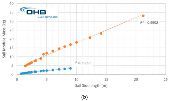The linear behavior shown on Figure 2b of the Sail Module mass with the Sail Sidelength is given by the following best fit equations, depending on the chosen boom technology: