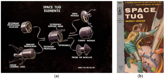 Two historical documents on “Space Tugs”: (a) a NASA drawing showing the various modules considered; (b) coverpage of one of the first documents (1953) citing and defining the “Space Tug” concept [7].
