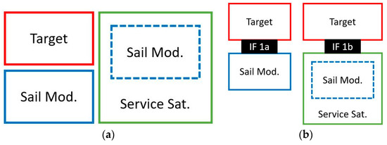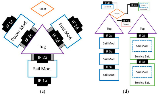 Main actors and interfaces involved in (Drag) Sail Modules operated from Space Tugs: (a) Target satellite, (Drag) Sail Module and Service satellite embedding or not a (Drag) Sail Module; (b) possible interfaces/attachments providing a (Drag) Sail Module to the Target satellite; (c) the Space Tug and some of its offered modules awaiting OOS usage. The Space Tug can be conceived of with or without a robot (e.g., arm); (d) a Space Tug with robotic arm offering Sail Modules (left); a Space Tug offering Sail Modules through Service Satellites, each equipped with a Sail Module (right).