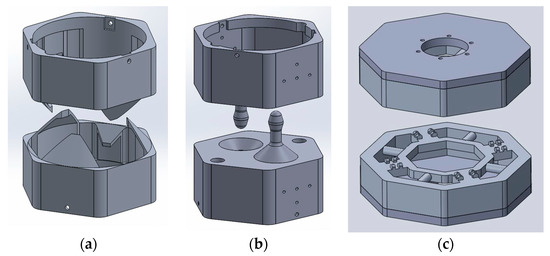 Having understood the main operations and interfaces between involved actors, the project initiated the design of In-Orbit Attach Mechanisms for (Drag) Sail Modules. After a survey of the main docking/berthing systems ever produced for Space applications (e.g., Apollo DS [10], SSVP [11], APAS/APAS-95 [12,13], IDSS [14], MCDS [15], UDP [16], ASSIST [17], OECS [18], and ASDS [19]), three mechanisms consisting of two identical androgyne (for ease of printability) parts were derived for this project: