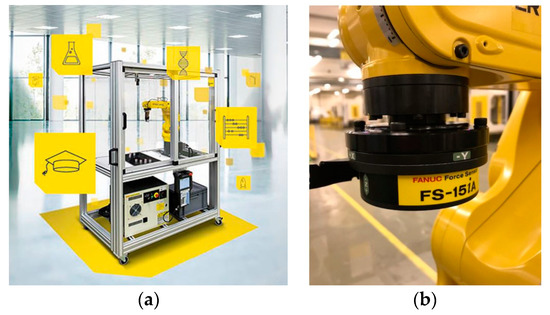 Robotic facility used for the automated test at FANUC Luxembourg, located in Echternach: (a) the FANUC Educational Package equipped with the 6-Axis Mechanical Robot LR-Mate 200iD/4S and (b) the auto-calibrating Force Sensor FS-15iA mounted on the robot of the facility.