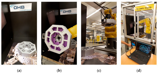 Final and complete test configuration used for the Automated Test on the 3rd Mechanism: (a) passive part of the prototype fixed on the test bench; (b) active part of the prototype (equipped with a “star tracker/docking” camera, visible on the left side) mounted on the robot via the force sensor; (c) a view of the principal elements of the test before sequence start (d) a view of the principal elements of the test during sequence—note on the laptop: the image taken simultaneously by the mounted “star tracker/docking” camera.