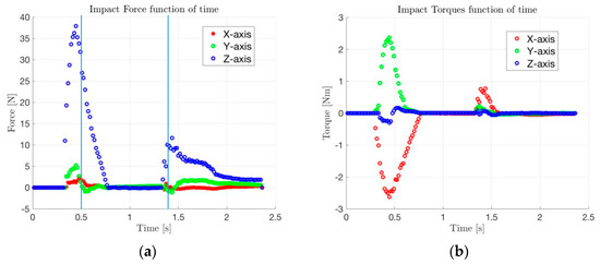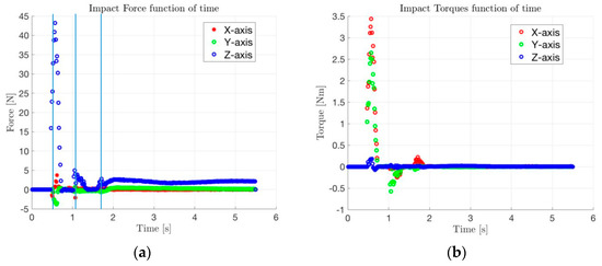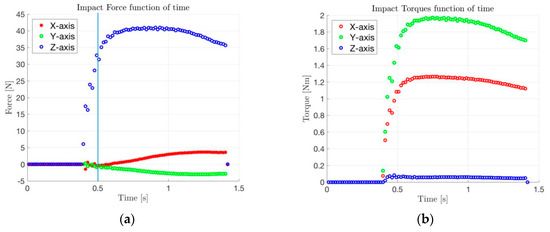 Nominal Case (v = 0.030 m/s; γ = 3.6 deg): (a) forces at impact and (b) torques at impact.