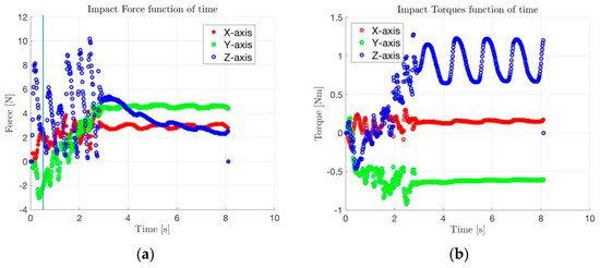 A clear and unique impact (force) along the Z axis is not noticeable around 0.5 s. Instead, oscillatory behaviors are observed and attributed to the control laws implemented by the “phase search” feature of the Force Sensor.