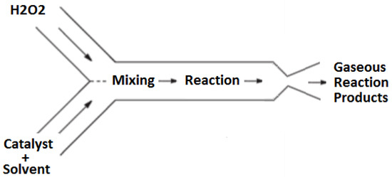 Here, n represents a mole fraction of water present in the hydrogen peroxide fuel; typically, the hydrogen peroxide concentrations ranges 85–90% by mass. In this propulsion design, the decomposition is achieved using a homogeneous catalysis approach wherein the catalyst is dissolved in a liquid solvent and reacts with the monopropellant in the liquid phase. The resulting exothermic reaction produces high temperature gaseous products that are subsequently passed through a converging–diverging supersonic nozzle to produce thrust. A high-level representation of this process is shown schematically in Figure 1.