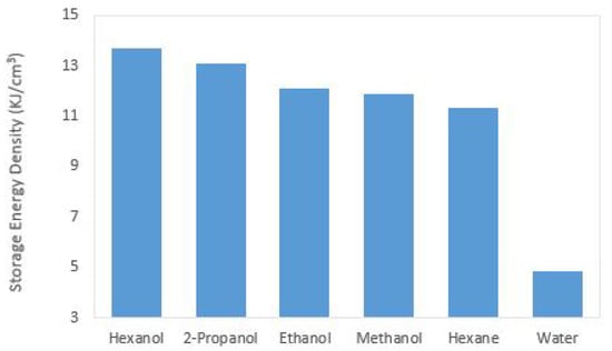 The relative expected performance of each solvent of interest based on three major performance and reliability characteristics including storage energy density, relative specific impulse, and solute concentration.