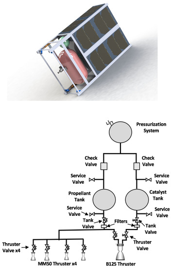 Summary of the B125 Propulsion System in development: (top) a solid model rendering of an envisioned 6U cubesat architecture; and (bottom) a system schematic diagram. Note that the tank configuration depicted above is not the tank configuration for the laboratory testing described in this study.