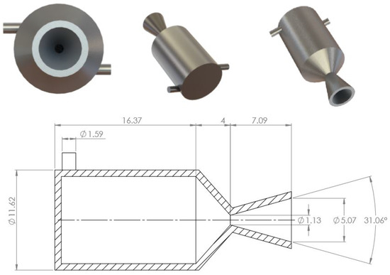 Schematic of the 50 mN attitude control thruster. Dimensions are in mm.