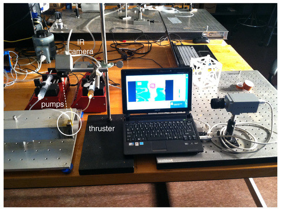 Photograph of thermal imaging set-up including thermal imaging camera, PixeLink camera, syringe pumps, and DMLS thruster.