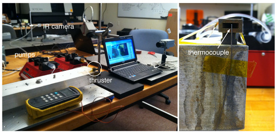 Thermal imaging of the system was performed using a thermoIMAGER TIM T900 manufactured by Micro-Epsilon (Raleigh, NC, USA). Thermal images were collected and analyzed using Micro-Epsilon’s thermal imaging software, TIM Connect. Along with thermal images, standard video was recorded using a PixeLink PL-B774U Color Camera. The thermal imaging camera was supported above the thruster, while the PixeLink camera was mounted to capture the side view of the thruster. Although the thermal camera was not calibrated to measure precisely the absolute temperatures of the materials, the thermal images nonetheless provide invaluable insight in the flow dynamics and operation of the system.