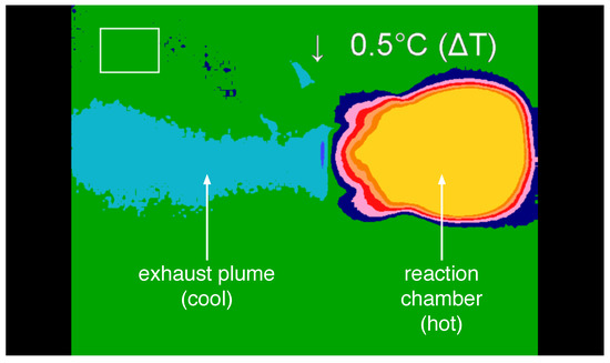 A thermal image of steady-state operation of the thruster using 15% aqueous ferric chloride as the catalyst solution and 87.6% HTP. The large temperature difference between the hot thruster reaction chamber (yellow) and cool exit plume (blue) is suggestive of supersonic operation.