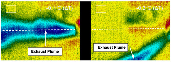 At high flow rates, the plume developed instabilities which caused the direction of the plume to oscillate between the walls and the center of the nozzle (Figure 16). When the flow direction changed, no noticeable changes in plume temperature or flow patterns were observed suggesting that the nozzle remained within the supersonic flow regime regardless of the flow instability. It is posited that the instability in the flow direction was caused by incomplete mixing and/or chemical decomposition in the thruster’s reaction chamber; this in turn would result in suspended liquid droplets and a multiphase flow through the nozzle at high operational flow rates. The basis for this speculation is rooted in the numerical simulations by Greenfield et al. [23] who demonstrated that multiphase flow within supersonic micronozzles at sufficiently large Stokes numbers can produce plume deflection.