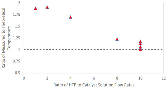 The ratio of measured to theoretical temperature vs. the ratio of volumetric flow rate of HTP to catalyst solution. High ratios of HTP to catalyst solution show agreement with quasi-one-dimensional isentropic supersonic flow in the nozzle. This strongly suggests the flow through the nozzle is choked at the throat at high HTP to catalyst solution ratios.