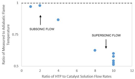 The ratio of measured to adiabatic flame temperature vs. the ratio of volumetric flow rate of HTP to catalyst solution. These data strongly suggest that, at low ratios of HTP to catalyst solution, flow is not choked at the nozzle throat and remains in the subsonic regime throughout the nozzle.
