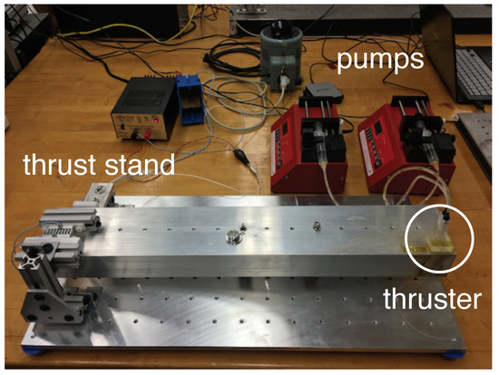 Measurements of thruster performance were taken on a custom-built torsional thrust stand, with a sensitivity of 1.0 mN and a sampling rate of 20,000 samples/s. The position of the torsion arm is measured by a Digital Voltage Reluctance Transmitter (DVRT, Lord MicroStrain, Williston, VT, USA), and captured using a National Instruments Model USB-6001 Digital Acquisition System (National Instruments Corporation, Austin, TX, USA). The positional data were converted real-time into raw thrust data and recorded for post-processing. The flow rate of the hydrogen peroxide and catalyst solutions entering the prototype thrusters was controlled via syringe pump. The prototype thruster was attached to the thrust stand and data collection began once the hydrogen peroxide and catalyst solution entered the mixing chamber.