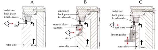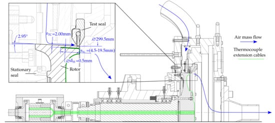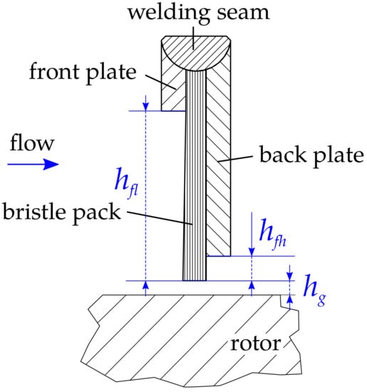 - Hildebrandt, M.; Schwitzke, C.; Bauer, H.-J. Experimental Investigation on the Influence of Geometrical Parameters on the Frictional Heat Input and Leakage Performance of Brush Seals. In Proceedings of the ASME Turbo Expo 2017: Turbomachinery Technical Conference and Exposition, Charlotte, NC, USA, 26–30 June 2017; American Society of Mechanical Engineers: New York, NY, USA, 2017; Volume 5B: Heat Transfer. [Google Scholar] [CrossRef]