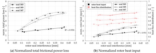 | total frictional power loss & heat flux distribution | rotor-seal interference [mm] | 0.1 | 0.2 | 0.3 | 0.4 | Tests ITS | |||||