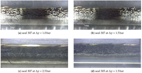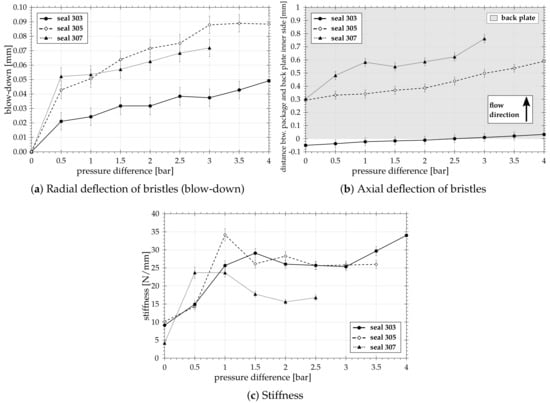 - The bristles of seals 305 and 307 begin to flutter during stiffness measurements above a differential pressure of 1.0 bar. As a result, the stiffness decreases significantly. Seal 303 is very stiff and shows no bristle oscillations.